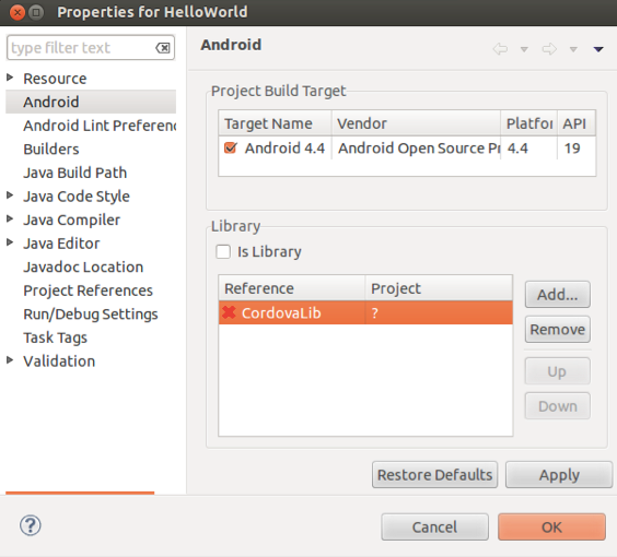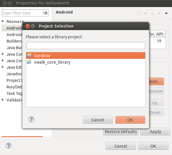 5.修改自己的phonegap项目。自己的phonegap项目,原本也是有一个依赖库CordovaLib,将原来的去掉,然后添加 `xwalk_core_library` and `framework`。添加完之后编译一次。项目就可以了。这时候用联机测试。