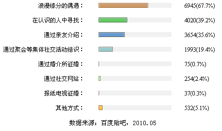 但是从报告上看,潜意识里年轻人在寻找结婚对象时,仍然愿意相信并坚持“浪漫缘分的偶遇”,选择该项的网友超过了一半。其次才是“在认识的人中寻找”和“亲友介绍”。看来“浪漫”仍然是让人迷恋的爱情催化剂。浪漫的偶遇、浪漫的求婚、精美的婚礼、再加上迷醉的蜜月之旅,青年人将二人世界的浪漫发挥到了极致。